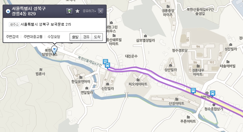 : 4호선 길음역 3번출구로 나오시면 바로 버스정류장이 보입니다. 버스정류장에서 143번 또는 110B로 환승하신후, 차고지에서 내리셔서 300m정도 걸어서 북한산 입구쪽으로 걸어오시면 됩니다.